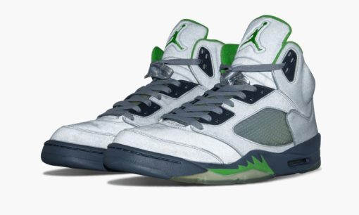 This unique colorway of the Air Jordan 5 from 2006 features a reflective silver upper accented with ‘Green Bean’ throughout.