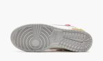 The Off-White x Nike Dunk Low ‘Lot 6’ is one of several colorways of the vintage basketball shoe created by Virgil Abloh and Nike in August 2021. The Off-White and Nike ‘Lot 50′ collection succeeds the brands’ mega-successful ‘The 10’ collaboration from 2017 that saw Abloh deconstruct some of the most iconic sneaker styles in Nike and Jordan Brand history. On ‘Lot 6,’ Abloh configures the colorway with a Sail canvas base with contrasting Neutral Grey leather overlays and Swoosh branding. Black ‘Nike’ detailing is found on the heel. Off-White’s signature Helvetica text appears on the medial side. A secondary, bungee cord-like lacing system is layered on the upper in purple. The look is consistent with the styling of Off-White’s first Nike Dunk collaboration from 2019. A traditional lacing system on the upper retains the Dunk’s original design. Underfoot, a yellow-and-white marbled ‘Lot 6 of 50’ insert on the midsole. Release date: August 9, 2021