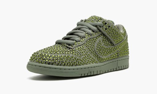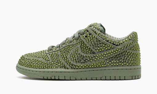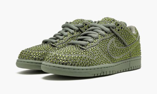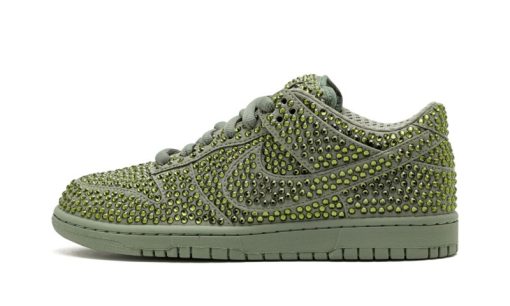 The Cactus Plant Flea Market x Nike Dunk Low ‘Swarovski – Spiral Sage’ is one of two premium colorways of the vintage basketball shoe created by the streetwear brand and Nike in 2020. The ‘Spiral Sage’ edition launched next to the equally opulent ‘Pure Platinum’ Dunk in November 2020. Both colorways were among the most talked about Dunks to release that year, an impressive feat considering the amount of noteworthy Dunk colorways and collaborations brought forth by Nike. The look pays homage to the ‘do-it-yourself’ trend of custom Dunks from the 2000s. The all-crystal-everything look defines the shoe as Swarovski crystals in Spiral Sage appear on not only the toe, overlays, tongue, and heel, but the Swoosh branding on either side, as well. Additional design elements include detachable lace flaps and Cactus Plant Flea Market’s Double Vision smiley face logo. Release date: November 18, 2020.