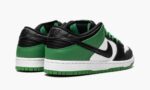 The Nike SB Dunk Low ‘Classic Green’ is a colorway of the low-top skate shoe that draws design inspiration from the Boston Celtics. In addition to referencing the storied basketball team’s uniform colors, the ‘Classic Green’s’ white, black, and green color block mimics the appearance of the Air Jordan 1’s original ‘Black Toe’ colorway. Specifically, the white leather perforated toe and contrasting black leather toe cap and forefoot replicate the look of the ‘Black Toe.’ As for the rest of the shoe, details include a black leather Swoosh, a Classic Green leather collar and heel, and green laces. Green ‘Nike SB’ and Swoosh detailing can be found on the black nylon tongue tag. Tonal ‘Nike’ branding is embroidered onto the heel. A two-tone, white rubber midsole and black outsole complete the clean look.