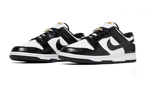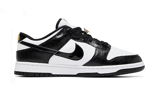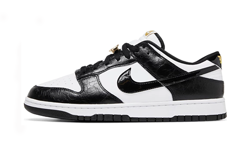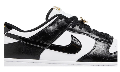 The Nike Dunk Low SE ‘World Champ’ belies the shoe’s simplistic two-tone color scheme with extravagant details inspired by professional wrestling. The low-top sports a white leather upper with contrasting black overlays that reveal a subtle cracked texture. Matching black accents land on the patent leather Swoosh and heel tab, the latter marked with embroidered Nike branding in metallic gold letters. Gold plated lace jewels replicate the look of a wrestling championship belt, while a purple-hued sockliner displays a zebra-striped Nike logo.