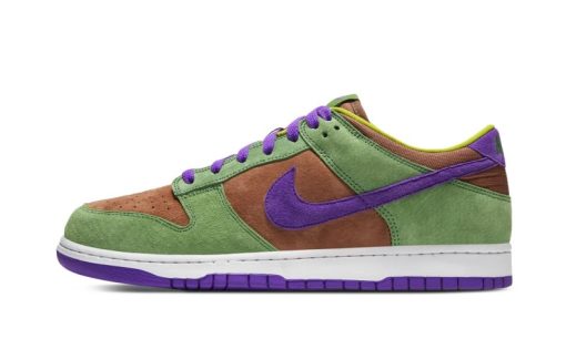 The Nike Dunk Low SP ‘Veneer’ is a nostalgic colorway culled from Nike’s Co.Jp archives that was given a wide scale release in November 2020. The ‘Veneer’ was originally one of three Dunks included in the ‘Ugly Duckling Pack,’ a Japan-only release in 2001. It released alongside the ‘Plum’ and “Ceramic” colorways, both of which were also brought back in 2020. The “Veneer” edition returns in true-to-original form as the same supple Autumn Green overlays appear on the forefoot, eyelets, collar, and heel. Brown or Veneer suede encompasses the perforated toe, mid-panel, nylon tongue, and collar. A contrasting shade of Court Purple on the laces and on the buttery suede Swoosh on either side adds a pop of color against the previously mentioned suede panels. Finishing touches include green Nike embroidery on the purple suede heel overlay, a white rubber midsole, and purple outsole. Release date: November 10, 2020.