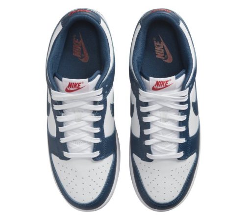 The Nike Dunk Low Valerian Blue arrives in a smooth white leather construction with deep Valerian Blue overlays and Swooshes. Hits of red on the woven tongue label and heel embroidery add a subtle contrast. At the base, a matching white and blue Air sole completes the design.