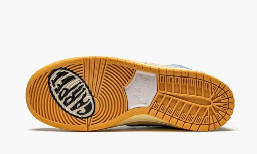 The Carpet Company x Nike SB Dunk High is a funky collaboration between the Baltimore based skateboard brand and Nike SB on the beloved skate shoe. In 2020, the Nike SB Dunk and standard Dunk recaptured their former glory and standing as some of the most playful and highly sought after shoes in Nike’s footwear collection. Due in no small part to the release of too-many-to name collaborations and returning ‘OG’ colorways, both the skate-ready SB Dunk and lifestyle Dunk were the ‘it’ shoes of the year. The momentum carried over in a big way in 2021 thanks to models like this Carpet Company design. White-and-blue bleached graphic overlays on the forefoot, eyelets, collar, heel, and Swoosh logo garner attention against the stark white leather base. The blue material can also be worn away or cut off to reveal another colorful graphic underneath. Carpet Company embroiders its ‘C’ star motif on the heel and a small tan suede overlay appears on the bottom of the mid-panel above the intentionally-aged yellow midsole. A co-branded tongue tag is stitched on top of the white mesh tongue and the gum rubber outsole provides plenty in the way of grip for skateboarding. Release date: March 12, 2021.