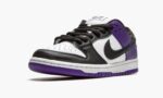 The Nike SB Dunk Low ‘Court Purple’ is a skate shoe with a colorway inspired by an Air Jordan 1 of the same nickname. Nike SB released the ‘Court Purple’ as part of its Spring 2021 collection. The design is one of several SB Dunks to reference popular Air Jordan 1 colorways over the years, joining the ‘J-Pack’ and ‘Space Jam,’ among others, to make the Jordan-to-SB Dunk jump. Details include buttery black leather overlays on the forefoot, eyelets, collar, and heel that contrast the white leather base. A black leather Swoosh appears on the mid-panel and Court Purple leather can be found on the heel. Black ‘Nike’ embroidery marks the back of the shoe. The SB Dunk’s signature puffy tongue design appears on the ‘Court Purple’ and provides the wearer with a cushioned ride for skateboarding. Additionally, the design of the outsole offers plenty in the way of grip for those who opt to skate the “Court Purple” SB Dunk Low.